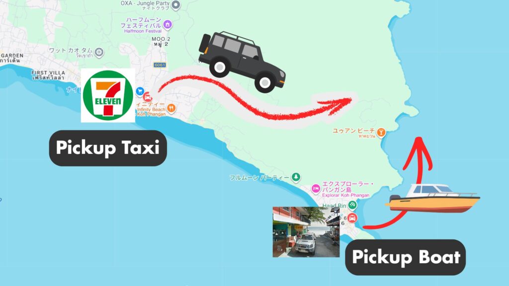 行き方は Haad Rin からタクシーボート(約15分)、または Ban Taiセブンイレブンからタクシートラック(約30分)。