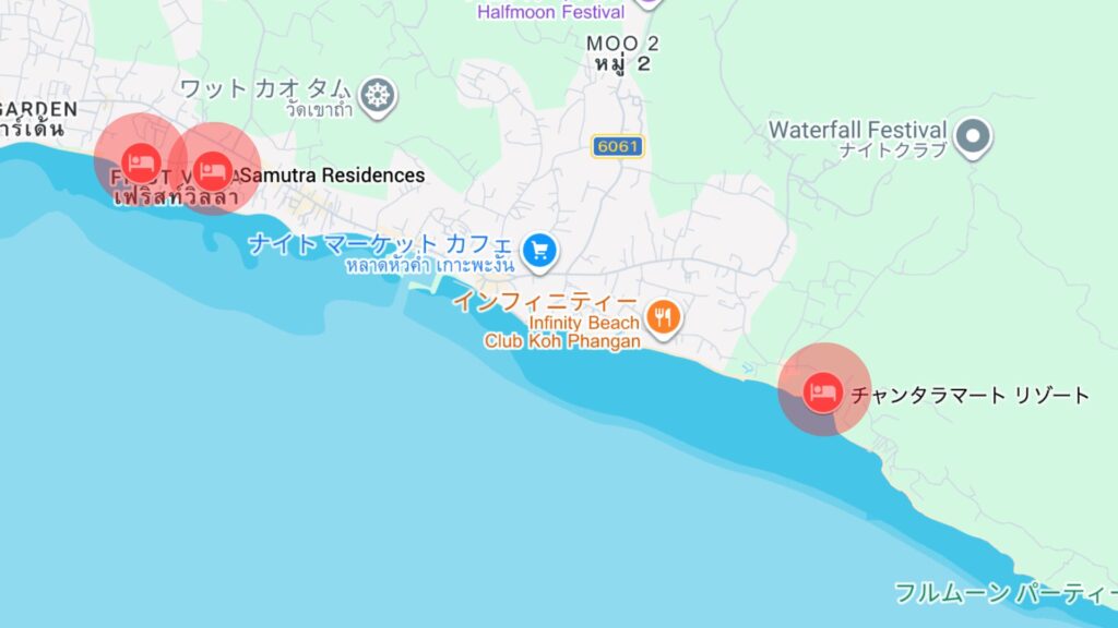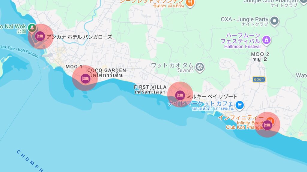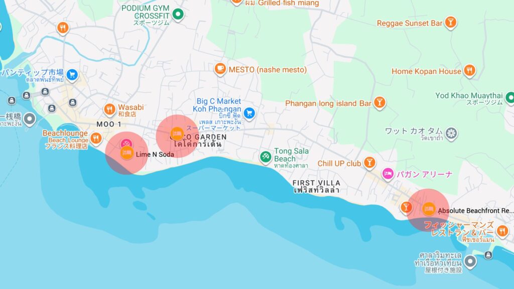 トンサラ寄りなら、港・飲食店・買い物・島内移動のしやすさが強く、バンタイ寄りなら、トンサラにもハードリン(Haad Rin)にも動きやすくて、イベント参加との相性がいいです。一方で、同じエリア内でも宿ごとにかなり個性が違います。